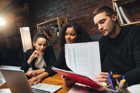 Profile side view of nice attractive focused concentrated professional skilled experienced coworkers partners leaders gathering preparing report at night preparing report at work place station