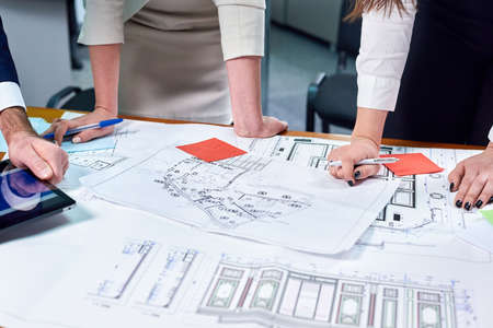 Close up of multiethnic hands on blueprints at architect office. Team of designer and engineers working together on new residence complex. Top view of architectural plan layout of house on table.