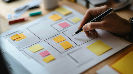 A hand holding a pen is sketching a layout on paper with colorful sticky notes. This image captures the essence of creativity and organization in a workspace.