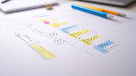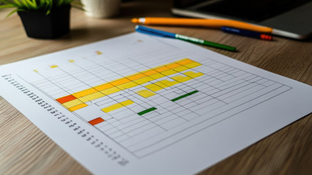 A vibrant project timeline chart displayed on a wooden desk, surrounded by stationery and a laptop, illustrating effective planning and management for teams.