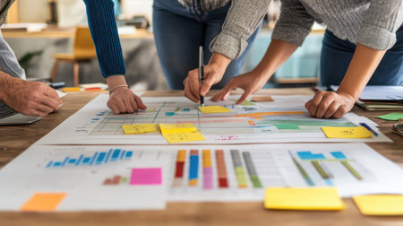 A team collaborates on project planning, using charts, notes, and colorful post-its at a table. The scene captures teamwork and creativity in action.