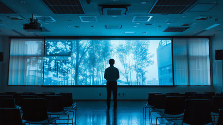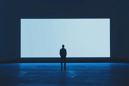 Businessman standing in dark room looking at large blank screen, analyzing data and thinking about future projects