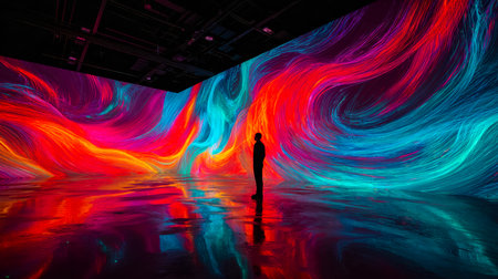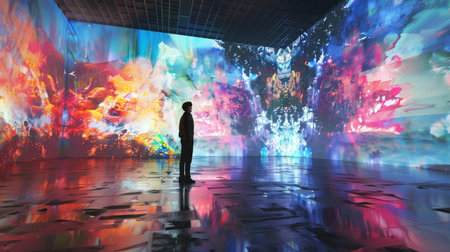 A lone man stands immersed in a stunning digital art installation, surrounded by a dynamic explosion of vivid colors and abstract patterns.