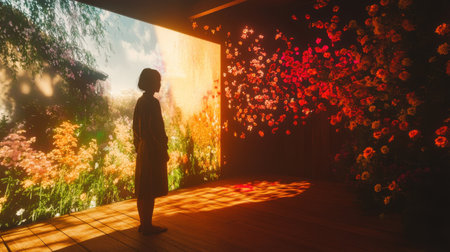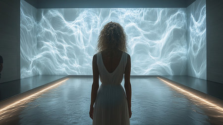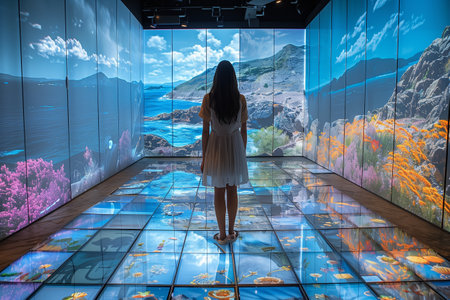 A Woman Stands in an Interactive Art Installation Featuring Coastal Scenes