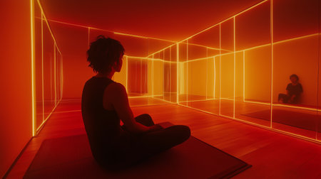 A person meditates in a room illuminated by soft orange neon lights reflecting off the walls during an evening session