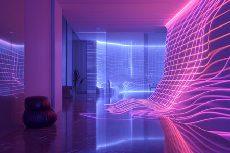 A room filled with purple light, creating a vibrant and atmospheric ambiance, A futuristic visualization of Wi-Fi signals spreading in a room, AI Generated