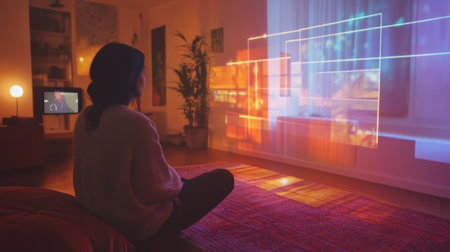 An openconcept studio apartment layout projected above a carpet with holographic dividers appearing and disappearing to showcase potential room configurations. Interactive prompts hel