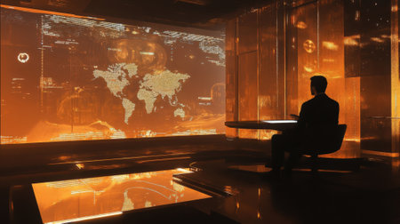 A sharpdressed individual sits in a hightech office interacting with a floating interface that depicts world maps and key performance indicators with subtle lighting enhancing the engagemen