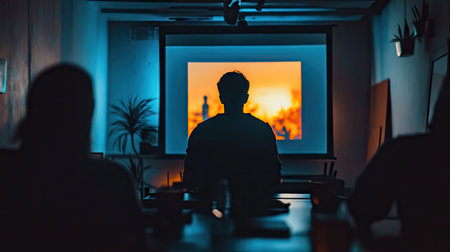 A captivating image of an individual watching a vibrant sunset projected on a screen in a darkened room, surrounded by team members, highlighting inspiration and creativity.
