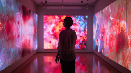 A person stands contemplatively in front of a large, colorful digital display, surrounded by the vibrant hues of red, pink, and blue. The atmosphere is filled with creativity and inspiration.
