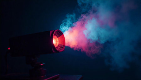 Projector emits smoke in vibrant colors against dark background