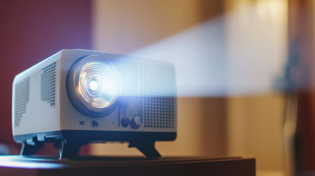 A modern home projector is positioned on a sleek table, casting a bright light in a cozy living room ambiance, perfect for entertainment and relaxation.