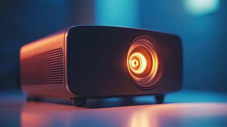 A sleek modern projector rests on a table, featuring a glowing lens and vibrant lighting. Ideal for showcasing technology and design in cinematic settings.