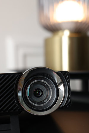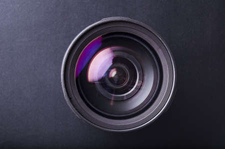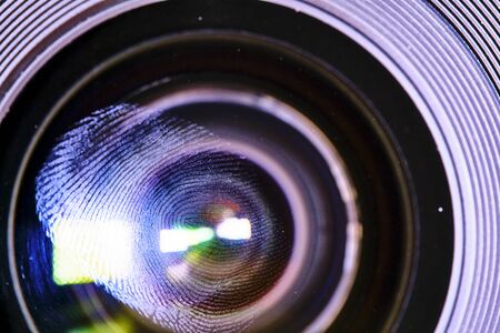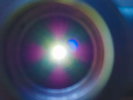 Close-up of a digital camera lens with dark light. Copy space for text.