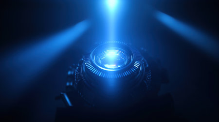 A close-up of a camera lens reveals its detailed structure, with bright blue light emanating from the center, illustrating the art of photography and light capturing technology.