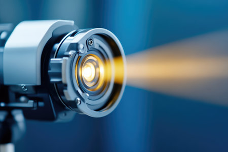 A warm, bright light emanates from the core of a high-tech projector lens, symbolizing the birth of a new idea.