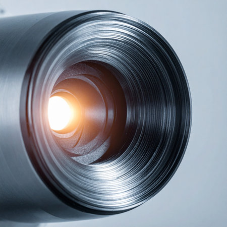 A close-up view of a camera lens with a reflection of light visible inside, showcasing the lens's intricate details and the way it captures and refracts light.