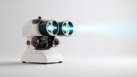 A vintage film projector emits a glowing light beam, creating a cinematic atmosphere. Ideal for themes related to film history, retro technology, and creative projects.