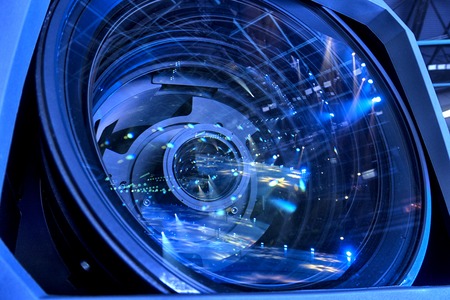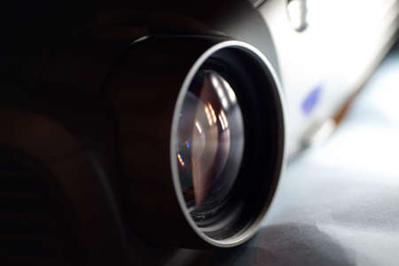 Close-up of a modern movie projector lens glowing in the dark, projecting a film onto the wall