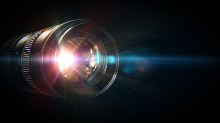 Camera lens with a radiant light flare against a dark background, symbolizing creativity and photography concepts.