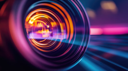 A detailed view of a camera lens positioned in a high-tech studio filled with colorful lighting. The intricate equipment reflects a contemporary atmosphere, highlighting the art of photography.