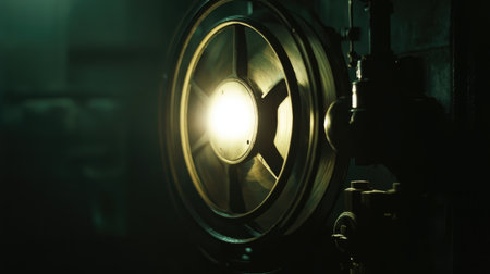 A close-up image showcasing a glowing light emanating from a vintage mechanical wheel, set in a dimly lit industrial environment, creating an atmosphere of intrigue and nostalgia.
