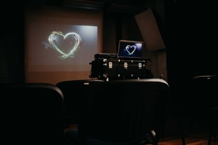 A view to the projection screen equipment at the decorated window curtain background of a banquet hall. Facilities for video and audio projection at a festive event. Show arrangement at a banquet