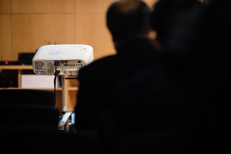 White screen projector in front of a screen in a conference or lecture hall with a white projector screen