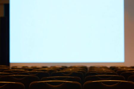White screen projector in front of a screen in a conference or seminar hall with a white projector screen