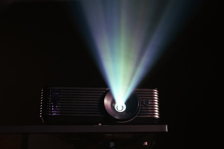 Vintage old fashioned projector in a dark room projecting a film, cinematography concept