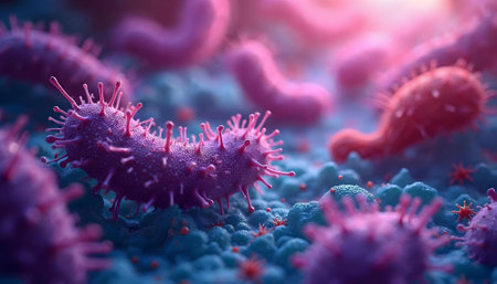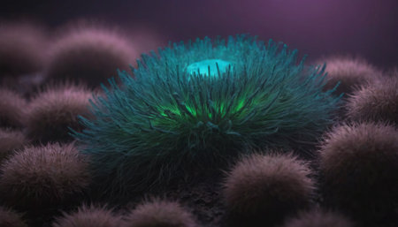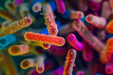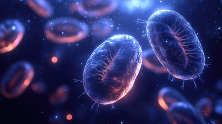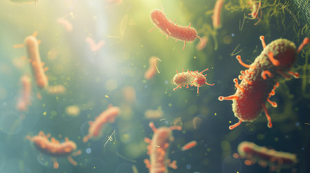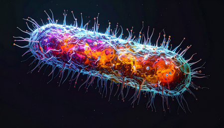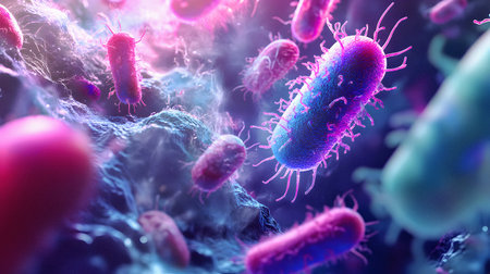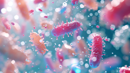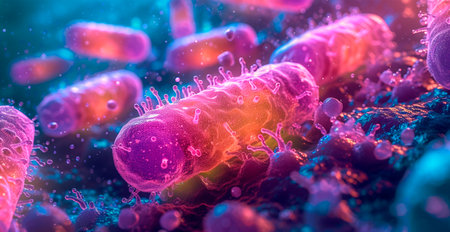 An intricate digital representation of bacteria displaying vibrant colors and glowing elements, highlighting the fascinating world of microscopic life in a stunning abstract setting.