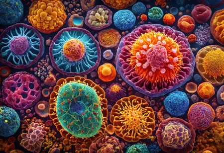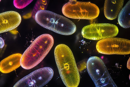 Bacteria and microbes under microscope showing colorful cells and detailed structures, vibrant scientific pattern for biology research.