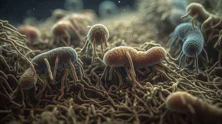 Close-up of diverse microorganisms and cellular structures, magnified under a high-powered microscope, revealing the hidden world of life on a microscopic scale