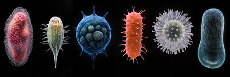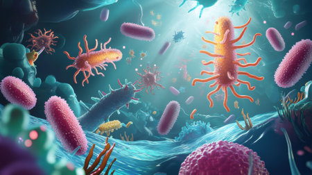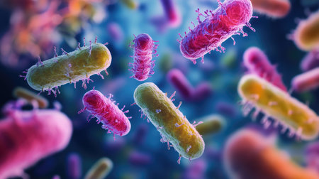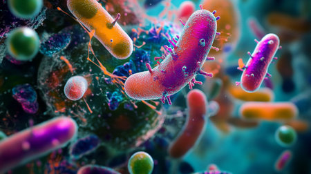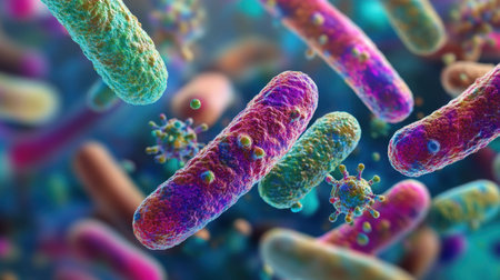 Colorful microscopic view of various bacteria microorganisms and cells showing diversity and complex structures in scientific research concept