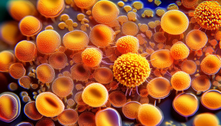 Microscopic View Vibrant Orange Bacteria, Detailed Structures on Soft Colored Backdrop