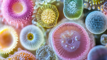 Discover a captivating microscopic world with colorful microorganisms floating gracefully in a liquid environment, showcasing intricate shapes and unique textures.