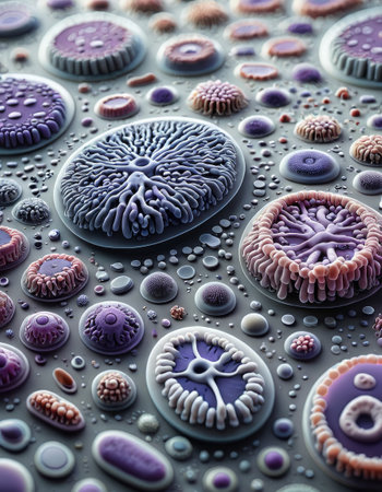 A vivid arrangement of microorganisms is displayed in shades of purple, highlighting distinct cellular structures and forms in a mesmerizing natural pattern.