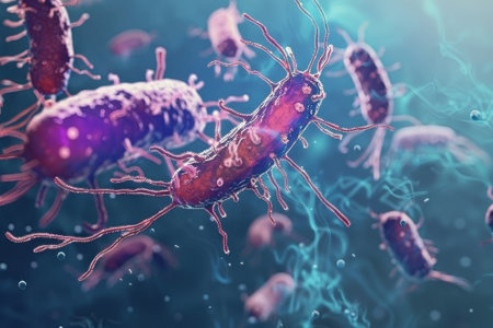 Colorful bacteria with flagella in green fluid
