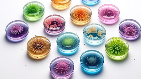 Colorful variety of microorganism inside petri dish plate background in laboratory with super macro zoom, including of bacteria, protozoa, algae, and fungi. Size and type colonies of microorganism.