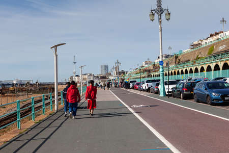 Brighton, England, October 07, 2018. People walking from Brighton Marina to the pier, view of the sea, shingle beach, selective focus