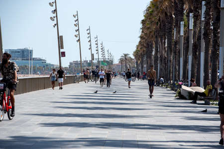 BARCELONA - JUNE 26, 2020: People Wal k Barceloneta Beach with Frank Gehry's Peix d'Or (Whale Sculpture) in summer after COVID 19 on June 26, 2020 in Barcelona, ​​Spain.