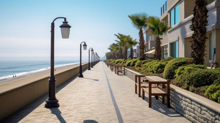 Bustling Coastal Promenade at Sunrise: Brisk Morning Walk