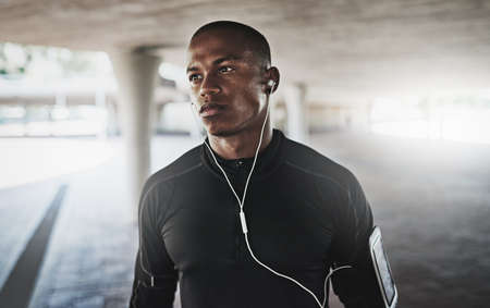 Young African fit woman listening music with headphones during workout session outdoor - Sport people lifestyle concept