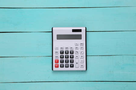 Calculator on blue wooden background