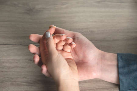 Close-up of the hands of a man and a woman. Male hands stroking the hands of a young woman stroking. Love and support concept
