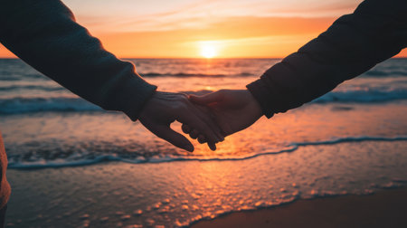 Two hands are gently clasped together during sunset in a peaceful outdoor location. The warm glow of the setting sun enhances the moment, creating a feeling of connection and intimacy.