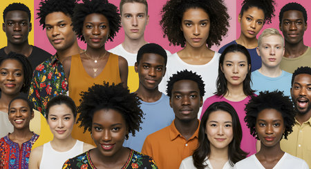 Diverse Group of Young Individuals Against a Vibrant Multicolored Background, Studio Portrait.