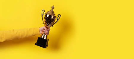 hand holding golden trophy over yellow background, panoramic image