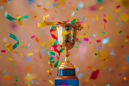 A shiny gold trophy adorned with colorful confetti gracefully falling around it in celebration of achievement