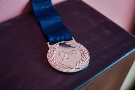 Close-up of a silver medal with a blue ribbon, symbolizing second place achievement.